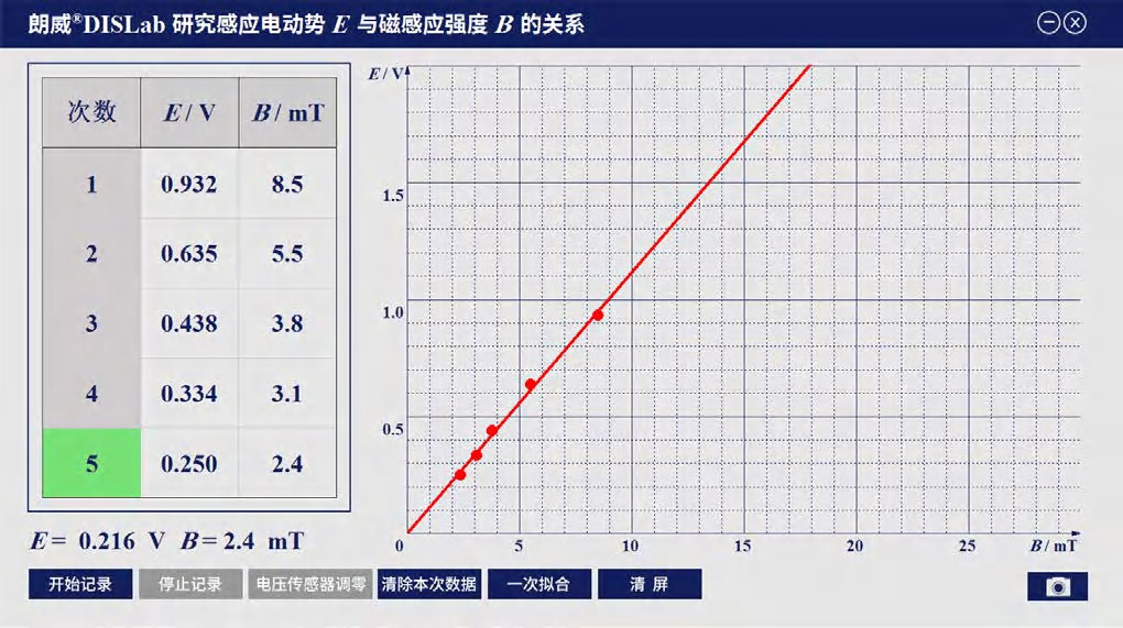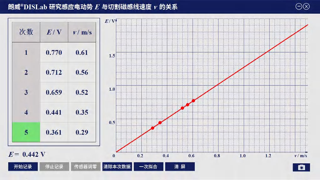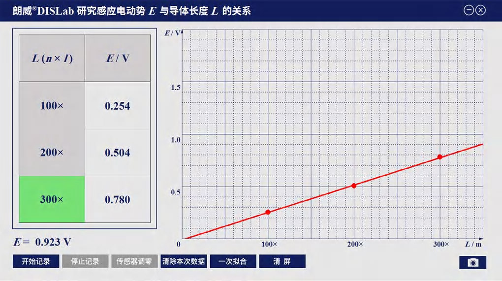 4 打开“研究感应电动势 E 与导体长度 L 的关系”,进行传感器调零;