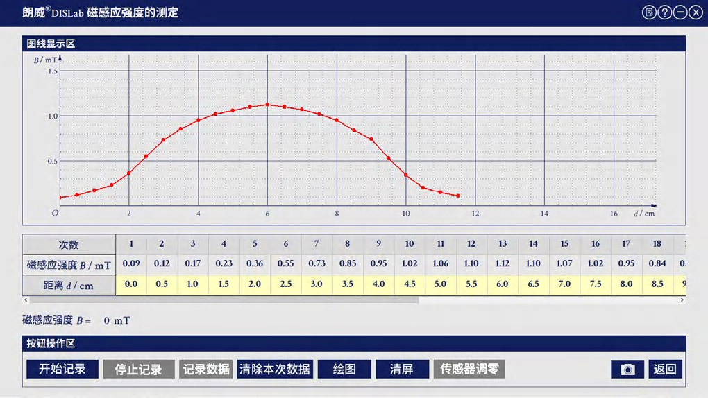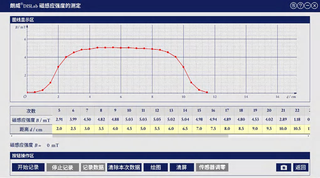 5 单击“数据记录”,记录当前的磁感强度值,软件默认此刻的距离 d 为“0”,将磁感应强度传感器探管缓慢推入螺线管,每次移动 0.5 cm,记录对应的磁感应强度值,得到多组数据;