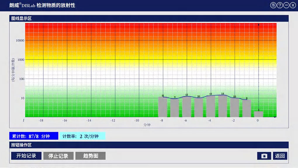 1 将 G-M 传感器接入数据采集器,进入专用软件。即使附近没有放射源,此时仍检测到有较低的计数率,此为本底计数率,如图 90 – 2 所示;