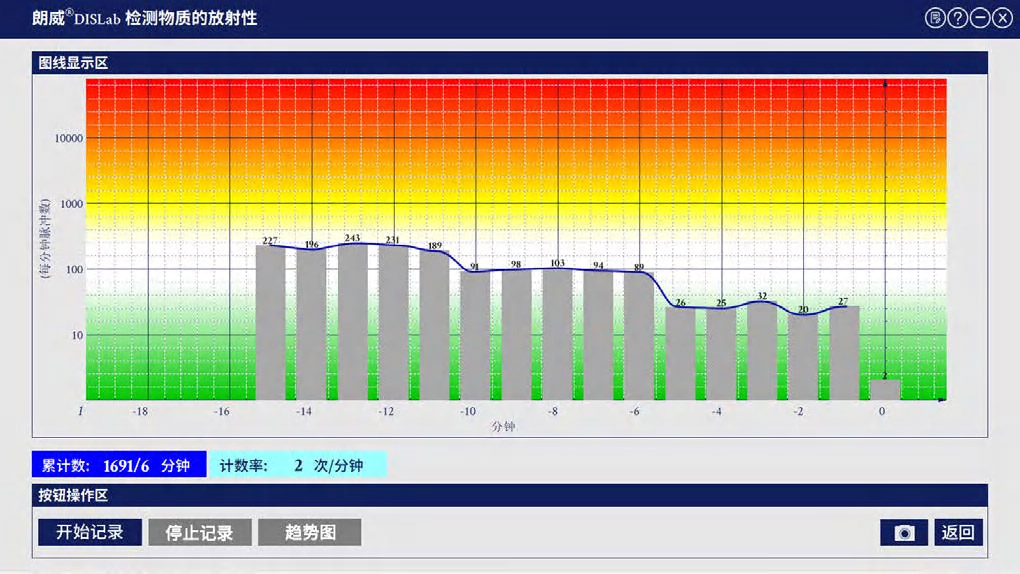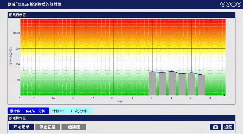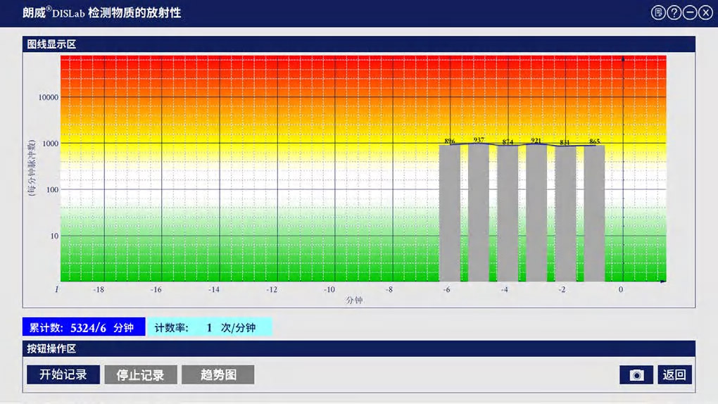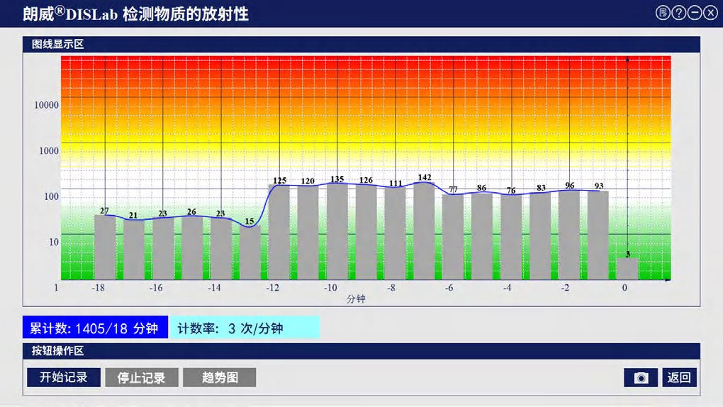 3 将威尔逊云室配套的放射源放置在距 G-M 传感器约 10 cm 处,可以发现计数率比本底数显著增加(图 90 – 3)。此时的计数率减去本底计数率,就是该放射源的计数率;