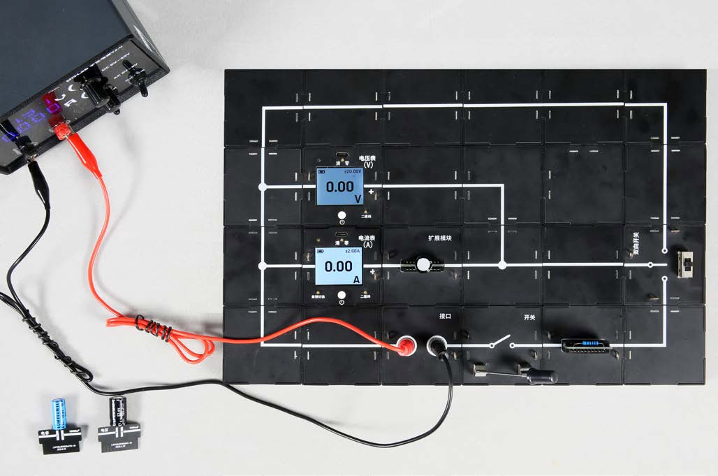 朗威 DISLab 方块电路(LW-SI816)(含双向开关、扩展板、电容、电阻等)多量程电流传感器(LW-E803)、电压传感器(LW-E841)、学生电源、导线等。