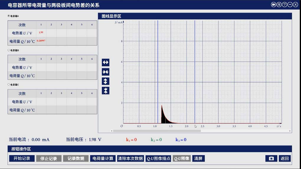 4 单击“停止记录”,单击“电荷量计算”,选择区域,系统自动将电荷量数据记入表格中;