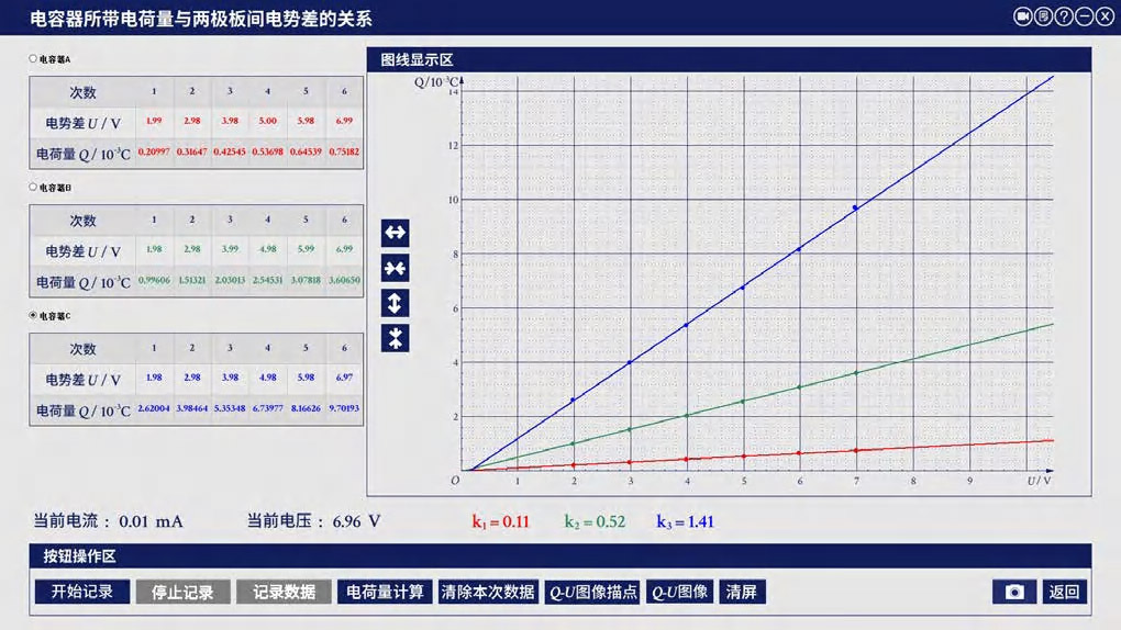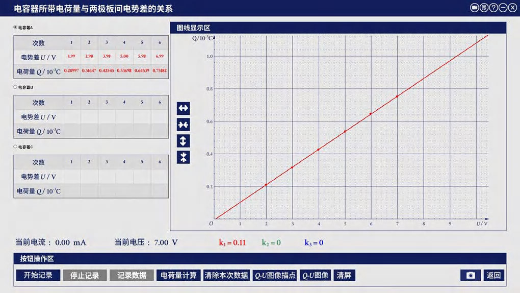 5 调节学生电源输出电压旋钮,改变输出电压,重复上述步骤得到多组数据,单击“Q – U 图线描点”,单击“Q – U 图像”(如图 97 – 3),得到相应图线;