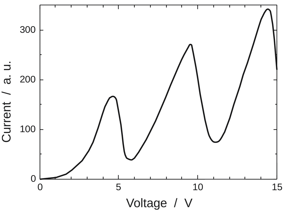夫兰克和G.赫兹的实验装置主要是一支充气三极管。电子从加热的铂丝发射,铂丝外有一同轴圆柱形栅极,电压加于其间,形成加速电场。电子多穿过栅极被外面的圆柱形板极接受,板极电流用电流计测量。当电子管中充以汞蒸气时,他们观测到,每隔 4.9 V 电势差,板极电流都要突降一次,如图 25 – 1 所示。如在管子里充以氦气,也会发生类似情况,其临界电势差约为 21 V。