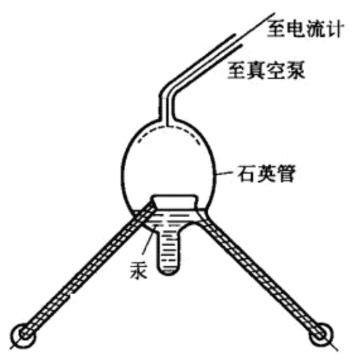 为了证明 4.9 V 电子束的能量是否等于波长为 2 536 Å 的辐射,夫兰克和 G.赫兹重新设计了实验方法。他们不能在同一个仪器上验证这种说法,因为 2 536 Å 的波长处在紫外区域。而管子的玻璃泡不能透过紫外线,因此他们用石英做了新管子,如图 25 – 2 所示。石英允许紫外光透过,管内仅有铂热丝 D,用来发射电子,还有铂栅极 N,用来加速电子和收集电子,管子底部盛有汞,其蒸气充满电极间空间。整个管子用煤气灯加热到 150℃,蒸气发出的辐射用紫外摄谱仪分析。