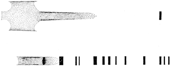 图 25 – 3 是夫兰克和 G.赫兹 1914 年在论文中发表的一张光谱照片。下面一排谱线是汞的电弧光谱,供参考用,在长波连续谱后跟着一系列分立谱线,强度各不相同。上面就是所谓的汞谐振线。除了长波连续谱和汞谐振线以外,其他谱线均未出现。显然,这个结果是量子论极为有力的又一实验证据。