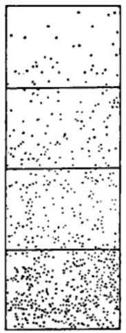 下一步是要测出给定面积的颗粒数。这可不是一项简单的工作,因为颗粒处在活动之中,几百个颗粒在视场中无规则地乱闯,时隐时现,这是无论如何也数不清楚的。机敏的佩兰,想到用照相术,这个方法果然奏效。他采取对同一层多次拍照的办法,数出每张照片上的颗粒数,再加以平均。然而直径比 0.5 μm 小的颗粒往往在照片上也看不清楚,于是,他又想了一个办法:在显微镜的焦面上放一块不透明的箔片,再用细针在箔片上扎一小孔,把视场限制在这个小孔里,用肉眼经显微镜观察一瞬间的颗粒数,每隔一定时间,例如 15 s,读一次数。读取多遍求出平均值就可看成是颗粒出现的平均频数。将显微镜调到另一层,重复读数。这两个平均频数之比就是浓度比。用这种方法测量,要达到一定的精度,没有几千次计数是不行的。