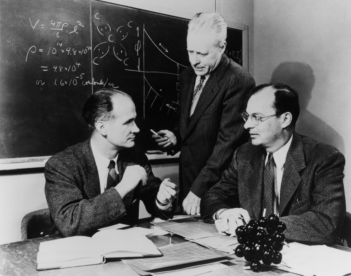 1956 年诺贝尔物理学奖授予美国加利福尼亚州景山(Mountain View)贝克曼仪器公司半导体实验室的肖克利(William Shockley,1910—1989)、美国伊利诺伊州乌尔班那伊利诺伊大学的巴丁(John Bardeen,1908—1991)和美国纽约州缪勒海尔(Murray Hill)贝尔电话实验室的布拉坦(Walter Brattain,1902—1987),以表彰他们对半导体的研究和晶体管效应的发现。