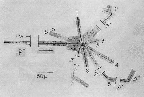 图 59 – 1 显示核乳胶中反质子的湮没。一个反质子(p−)停下来,与另一个原子核中的核子一起湮没。π 介子和其他粒子正从碰撞点离开而去。可看到的粒子能量大于静止状态下的反质子的能量。这表明还有一个粒子在湮没。