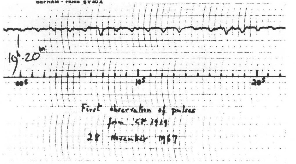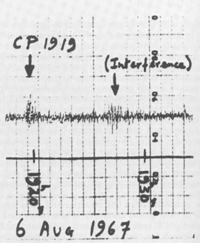 1967 年 7 月,这套装置投入运行。贝尔负责观测,每周重复巡视一次,每周输出的记录纸大约 400 英尺。8 月的一天,贝尔注意到有一个“异常的闪烁源”,休伊什认为可能是一颗射电耀星,于是决定用快速记录仪确定信号的性质,看一看它是否与太阳耀斑的射电有相似的性质。由于这个源时隐时现,一直等到 11 月 28 日才成功地记录到这个起伏信号是一系列强度不等的脉冲。休伊什利用精确的时标,并修正了地球轨道运动的影响之后,惊讶地发现脉冲的守时精度竟优于一千万分之一,脉冲周期为(1.337 279 5±0.000 000 2)s。