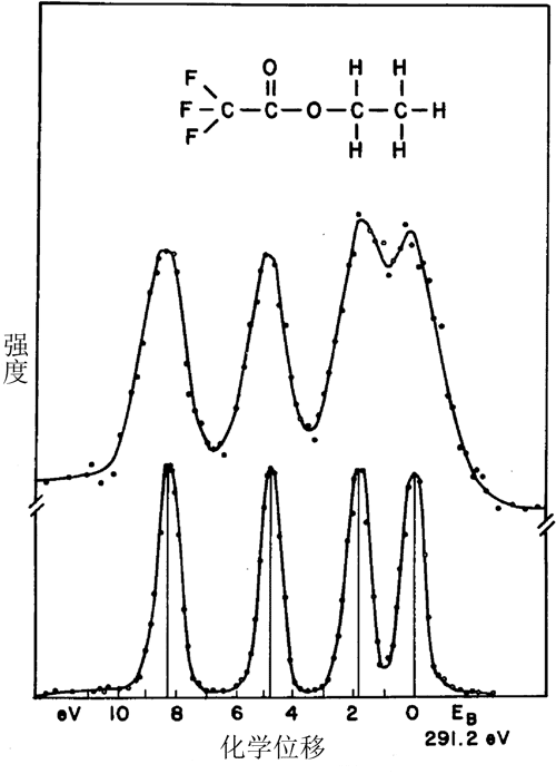 图 81 – 5 是凯·西格班在 1981 年诺贝尔物理学奖演说词中所展示的一张图,这张图说明三氟乙酸乙酯(CF3COOC2H5)中碳的 1 s 电子的 X 射线光电子能谱。图中上方是三氟乙酸乙酯的化学式,中间的谱是用未加单色器的 X 射线源所得,下方的谱是用单色化后的 X 射线所得。曲线中四个峰就是碳原子的化学位移,相当于分子中四个碳原子的 1 s 电子的结合能(横坐标表示能量值)。这是因为三氟乙酸乙酯(CF3COOC2H5)分子中的四个碳原子分别处于不同的化学环境中,跟四种具有不同负电性的原子结合。由于氟的负电性最大,CF3− 中的碳原子的结合能最高,约达 300 eV,图 81 – 5 中曲线最左侧的峰就是这个碳原子的光电子能谱峰。