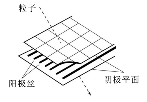 现在的粒子物理实验要求记录粒子径迹能够做到高精度和大面积覆盖,用一层层这样的老式正比计数管覆盖大的面积是不现实的,也不可能达到需要的空间精度。突破来自夏帕克发明的多丝正比室。图 92 – 1 示意性地表明了多丝正比室的结构原理。这种装置由大量平行细丝组成,所有这些细丝都处于两块相距几厘米的阴极平面之间的一个平面内,阳极细线的直径约为十分之一毫米,间距约为一或几毫米。当时人们普遍认为,这类多丝结构会因相互感应等问题而不能正常工作。夏帕克则与人们普遍的想法相反,1968 年提出,每根丝都会像正比计数管一样地工作,并可使空间精度达到一毫米或者更小些。每根丝都能承担极高的粒子记录速率,可高达每秒几十万次。在当时这已是异常的高速率了。同时,多丝正比室结构易于做成大面积,并能以模块方式组成所需的各种体积和形状,适于进行不同规模和特点的实验。
