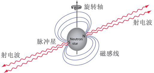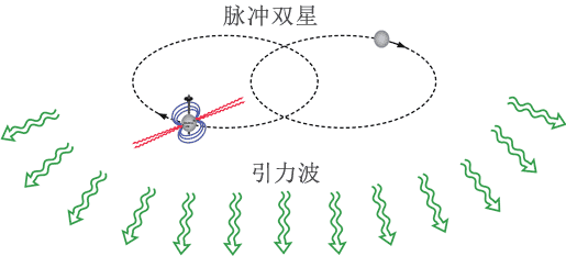 赫尔斯和泰勒 1974 年发现了第一颗脉冲双星(称为 PSR 1913 + 16,PSR 代表脉冲星,1913 + 16 表示脉冲星在天空的位置)。这件事引起了这个领域中的一场革命。这里我们有两个非常小的天体,每个天体的半径只有大约十公里,但其质量却相当于太阳,两者的距离甚近,仅为月地距离的几倍。在这种情况下有大的对牛顿引力物理学的偏离。可以举一个例子来说,根据从 17 世纪初就提出的开普勒第一定律,脉冲星在这样的体系中的椭圆轨道每年应旋转 4 度,这也叫近星点运动。在我们太阳系里作为最显著的例子,及前面提到的水星近日点运动相应的相对论旋移,每世纪只有 43 弧秒(别的行星主要是金星和木星的摄动引起的近日点运动要大得多,相对论旋移小于其十分之一)。旋移之间大小的差别部分是由于脉冲双星的轨道速率几乎比水星大 5 倍,部分是由于脉冲星在一年中走完的轨道数比水星多 250 倍。脉冲双星的轨道周期小于 8 小时,可与月亮绕地球转一周所用的一个月相比。新脉冲皇有一个非常重要的特性,就是它的脉冲周期即两个信号扫描之间的时间(0.059 03 s)已证明是极为稳定的,这与其他许多脉冲星相反。脉冲星的脉冲周期在一百万年内增加不到 5%。这就意味着脉冲星可以当作钟来使用,其精确度与最佳的原子钟相当。在研究该体系的特性时,这是一个非常有用的特征。