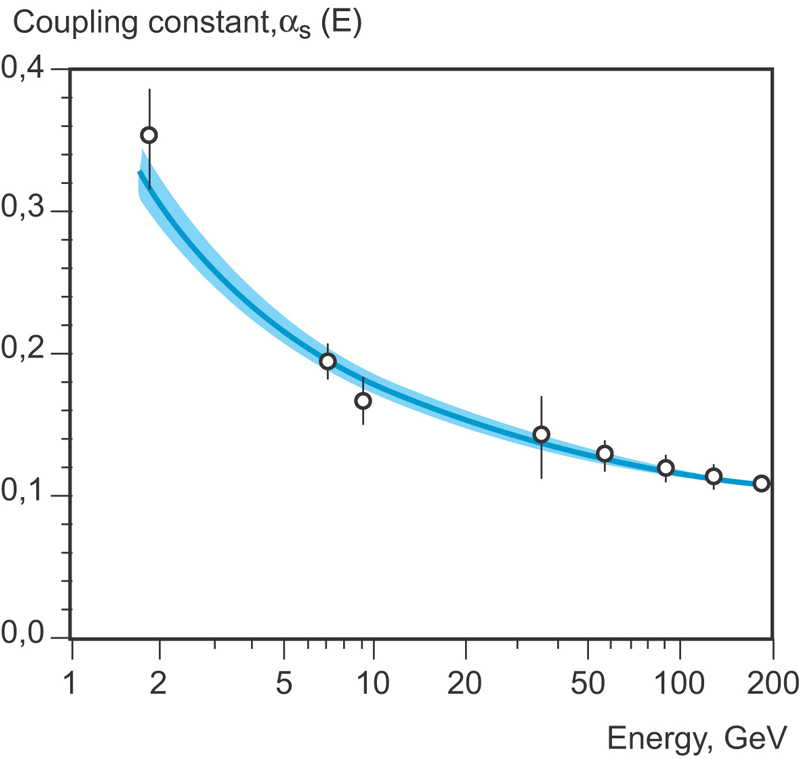 渐近自由使得计算夸克与胶子微小距离间的相互作用有了可能,只要假设它们是自由粒子。以极高的能量撞击粒子有可能使它们靠得很近。渐近自由被发现后,建立了量子色动力学,第一次作了计算,证明与实验相符甚好(图 2004 – 2)。