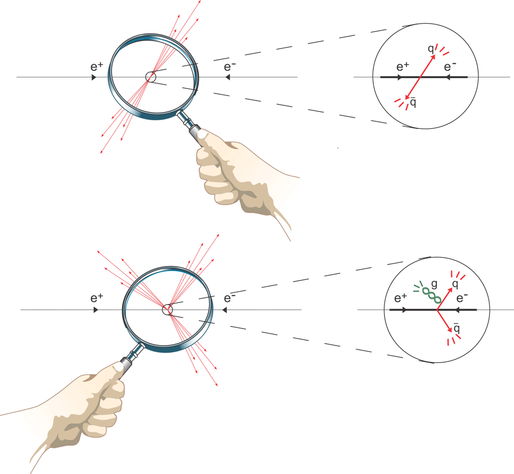 当电子和其反粒子(正电子)互相湮灭时,它们以极高的动能碰撞,这种碰撞给 QCD 理论提供了重要证据。根据爱因斯坦方程 E = mc2,动能可以转变成新的粒子,例如携有质量和动能的夸克。在这一过程中产生出的夸克,互相间靠得很近,却以极高的速率互相离开。