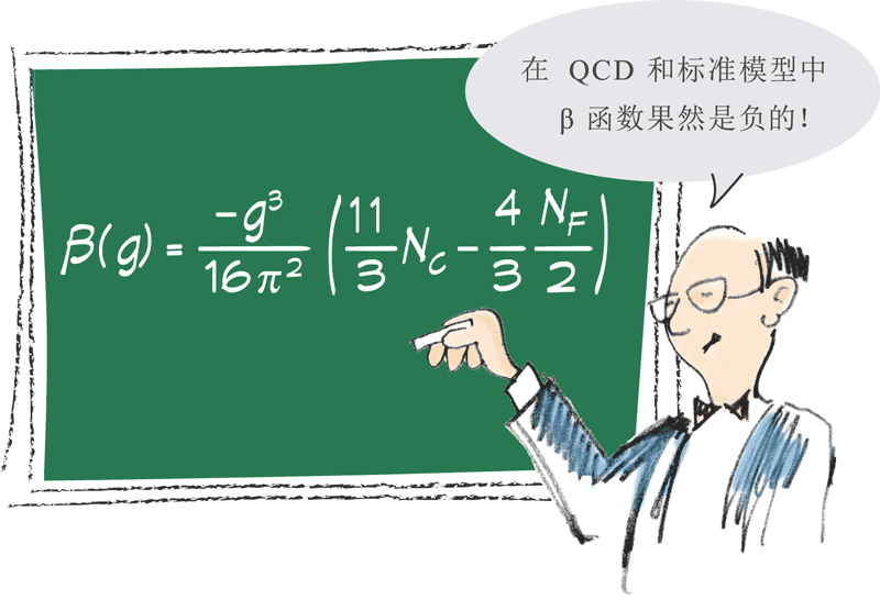 已故的德国理论物理学家西曼切克(Kurt Symanzik)认识到,唯一的办法就是建立一个合理的理论,能够包含负的 β 函数。这样的理论就可以解释为什么夸克在质子中反而像是自由粒子。这样的效应在电子、质子的非弹性散射实验中已经观察到。