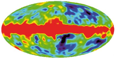这只是 COBE 所得结果的一部分。斯穆特负责的实验是寻找不同方向微波背景的微小差异。宇宙间不同部分的微波背景温度如果有极小的差异,就可以提供新的线索,以解释星系和恒星是如何形成的,还可以解释为什么宇宙中的物质在某些区域浓缩,而不是均匀地抛洒。