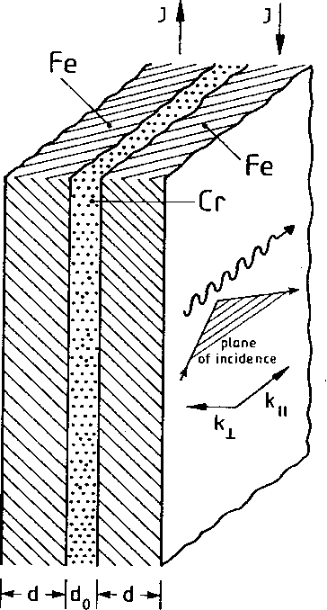 为了深入研究铁磁性材料的表面自旋波,格鲁伯格选择了铁薄膜样品,继而转向以铬薄膜作为隔层的双层铁膜,或者叫做铁/铬/铁(Fe/Cr/Fe)三层膜。之所以选铬作为隔层,一是因为铬是非铁磁性材料;二是因为它与铁非常匹配,有相似的晶体结构和热力学特性,便于外延生长。