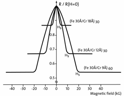 图 2007 – 3 是费尔小组最初报道的实验结果。图中横轴为外磁场强度,纵轴为电阻的变化。不同的曲线显示了磁膜层数和非磁性层厚度对磁电阻的影响,可以看到由 9 Å(1 Å = 0.1 nm)厚非磁性层分隔的多层磁膜的电阻,在磁场的作用下几乎减小了 50 %。