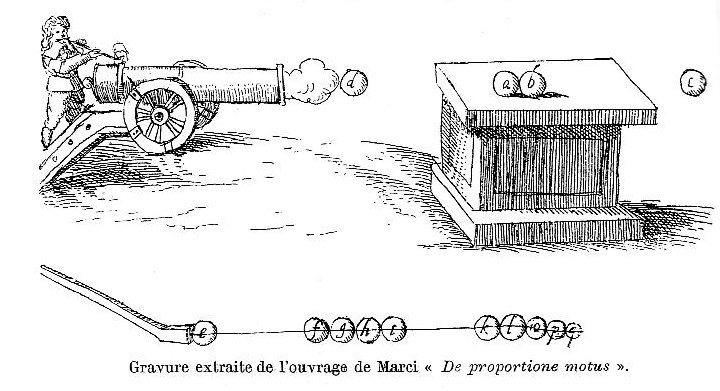 另外有一位物理学家叫马尔西(Marcus Marci,1595—1667),布拉格大学校长,在 1639 年发表了他研究碰撞问题的一些成果。书名是《运动的比例》(De Proportione motu)。在书中有一幅很生动的插图,如图 1 – 38,一大理石球对心撞击一排大小相等的大理石球,运动传递给最后一球,中间一点不受影响。他的结论是:一个物体与另一大小相同处于静止状况的物体作弹性碰撞,就会失去自己的运动,而把速度等量地交给另一物体。不过他没有作出理论分析。