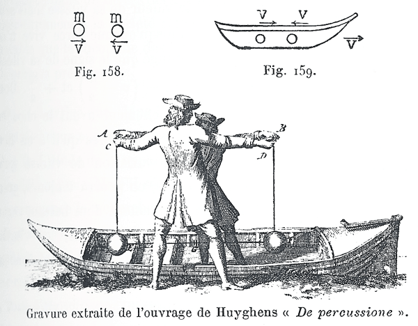 例如,他举了一个在船上进行碰撞实验的例子,他想象有一个人站在速度为 u 的船上,手中吊着两个球。两球分别以速度 v 从相反方向作对心碰撞。根据第三个假设,船上的人所看到的是两球分别以 v 反弹,但从岸上看来,却是更复杂的情况,两球以速度(v + u)和(v − u)相撞,又以(v − u)和(v + u)反弹。于是,惠更斯得出结论:两个相同的球以不同的速度作对心碰撞,彼此将会交换速度。