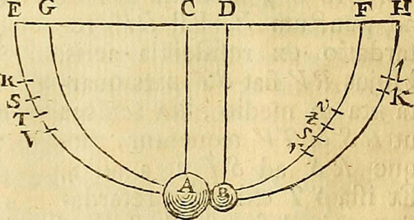 “我尝试用这个方法进行实验,摆长取 10 英尺,物体有时相同,有时不同。令物体从很大的距离,例如 8,12 或 16 英尺处下荡,以相反的方向相遇,结果是双方在运动中产生同等的变化,即作用和反作用恒等,所差不超过 3 英寸。例如物体 A 以 9 份运动撞到静止的物体 B,损失掉 7 份,碰撞后以 2 份继续前进,则物体 B 将以 7 份运动反弹。如果两物体从反方向相撞,A 以 12 份运动,B 以 6 份运动,而如果 A 以 2 份后退,B 将以 8 份后退,双方各减 14 份…”[2]