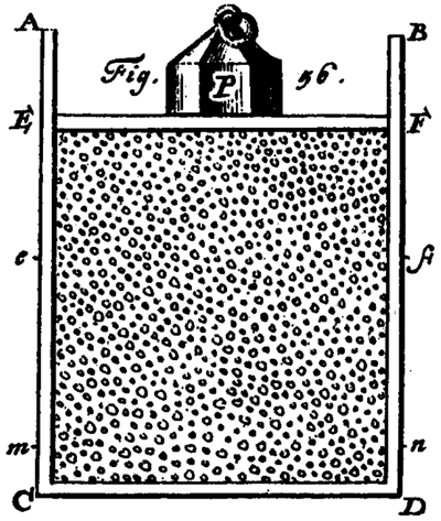 为了计算第一种原因带来的影响,伯努利考虑粒子似乎都是静止的。若取 EC = 1,eC = S。活塞从 EF 移到 ef 时,其高度由 1 减至 S。考虑到粒子均匀分布,三个垂直方向粒子数因此各增 1/S1/3 倍,那么接近活塞处的粒子数应由 n 增至 n/S2/3。他认为粒子是直径为 d 的球体,初始平均距离为 D,则粒子表面之间的平均距离为 D − d。活塞落下后,粒子间的平均距离为 DS1/3,所以表面之间的平均距离为 DS1/3 − d。