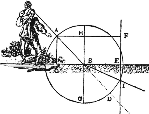 笛卡儿不久也推导出了同一结果,他用图 4 – 7 说明自己的思想。在他的名著《方法论》(1637 年)中有一附录,也叫《屈光学》,其中写道: