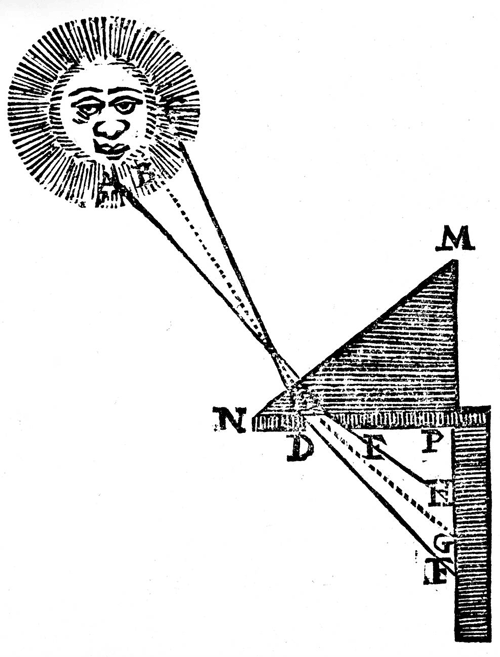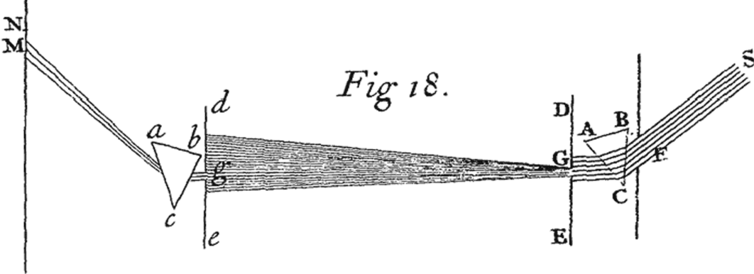 1648 年,布拉格的马尔西用三棱镜演示色散成功。不过他解释错了。他认为红色是浓缩了的光,蓝色是稀释了的光;之所以会出现五颜六色,是由于光受物质的不同作用,因而呈现各种不同的颜色。