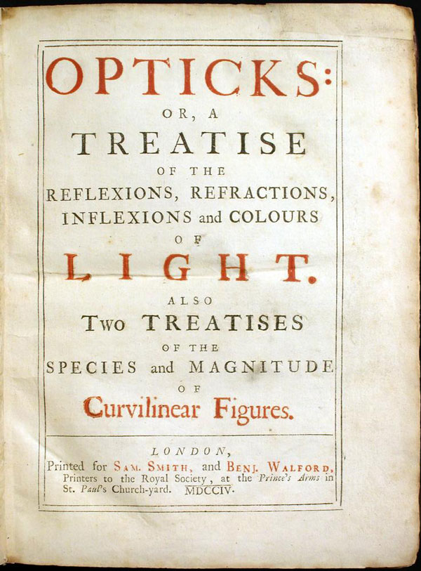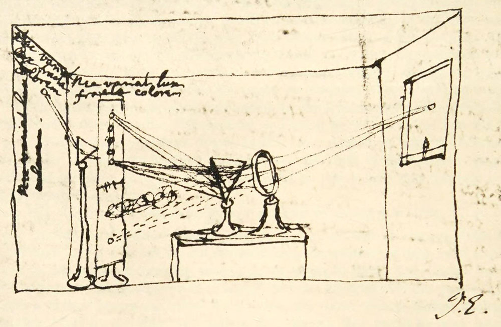 牛顿从笛卡儿等人的著作中得到许多启示。例如笛卡儿说过:“运动慢的光线比运动快的光线折射得更厉害”。胡克描述过肥皂泡的颜色变化,认为不同的颜色是光脉冲对视网膜留下的不同印象。红色和蓝色是原色,其他颜色都是由这两种颜色合成和冲淡而成。牛顿注意到这些说法的合理成分,同时也提出许多疑问。在牛顿留下的手稿中,记录了许多当年的疑问和思考,例如,他问道: