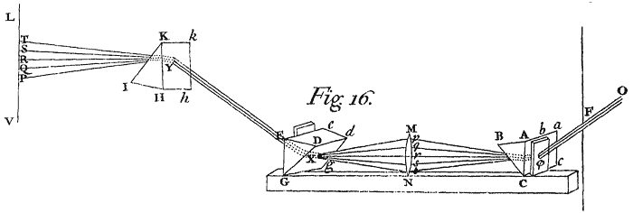 牛顿从笛卡儿的棱镜实验得到启发,又借鉴于胡克和玻意耳的分光实验。胡克用了一只充满水的烧瓶代替棱镜,屏距折射位置大约 60 厘米,玻意耳把棱镜散射的光投到 1 米多高的天花板上,而牛顿则将距离扩展为 6 米 ~ 7 米,从室外经洞口进入的阳光经过三棱镜后直接投射到对面的墙上。这样,他就获得了展开的光谱,而前面的几位实验者只看到两侧带颜色的光斑。牛顿高明之处就在于他已经意识到了不同颜色的光具有不同的折射性能,只有拉长距离才能分解开不同折射角的光线。