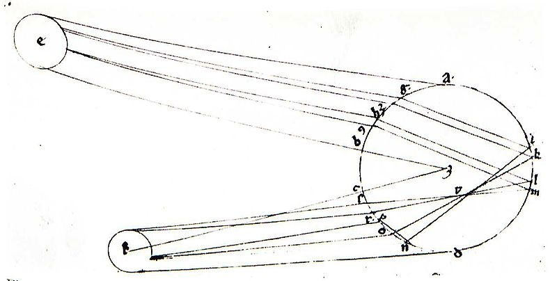 色散也是一个古老的课题,最引人注目的是彩虹现象。早在 13 世纪,科学家就对彩虹的成因进行了探讨。德国有一位传教士叫西奥多里克(Theodoric),曾在实验中模仿天上的彩虹。他用阳光照射装满水的大玻璃球壳,观察到了和空中一样的彩虹,以此说明彩虹是由于空气中水珠反射和折射阳光造成的现象。不过,他的进一步解释没有摆脱亚里士多德的教义,继续认为各种颜色的产生是由于光受到不同阻滞所引起。光的四种颜色:红、黄、绿、蓝,处于白与黑之间,红色接近白色,比较明亮,蓝色接近黑色,比较昏暗。阳光进入媒质(例如水),从表面区域折射回来的是红色或黄色,从深部折射回来的是绿色或蓝色。雨后天空中充满水珠,阳光进入水珠再折射回来,人们就看到色彩缤纷的景象。图 4 – 9 是他解释彩虹形成的一页手稿。