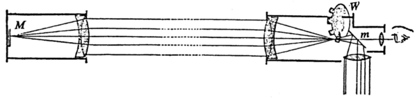 1849 年斐索先用旋转齿轮法求得光速 c = 3.153×108 米/秒。他是地面上用实验方法测定光速的第一位实验者。实验装置如图 4 – 33 所示。光从半镀银面 m 反射后经高速旋转的齿轮 W 投向反射镜 M,再沿原路返回。如果齿轮转过一齿所需时间正好与光往返的时间相等,就可经半镀银面观测到光,从而根据齿轮的转速计算出光速。