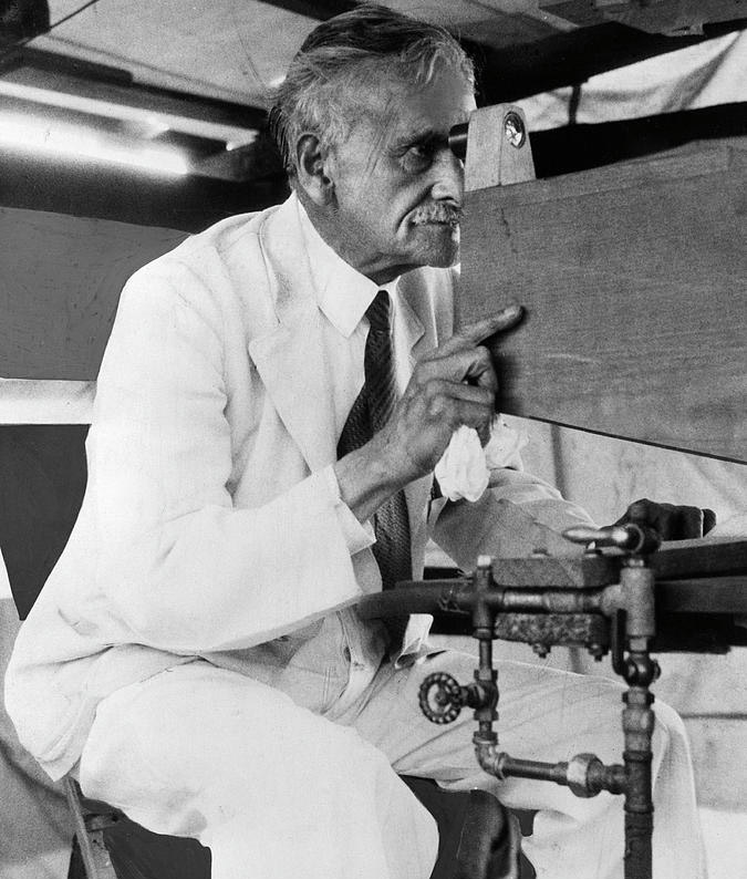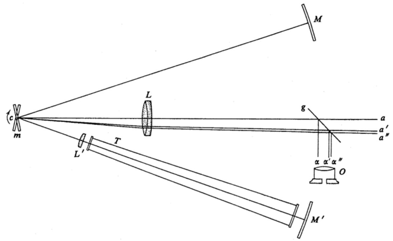 1728 年英国天文学家布拉德雷(James Bradley,1693—1762)根据恒星的光行差再一次得出光速。他曾长期观测某些恒星的方位,数据经过仔细校正后,把恒星一年十二个月的位置折算到天顶,发现都是一些圆形轨迹。难道恒星的位置不恒定吗?布拉德雷苦思不得其解。据说,有一天他乘帆船航行,偶然注意到当船改变航向时,船帆上的旗帜飘向不同方向,他猛然省悟,这不就是一种相对运动吗?恒星的圆周轨迹正是因为地球围绕太阳旋转的缘故。根据圆周轨迹的半径对地球所张的角(叫做光行差角)及地球公转的速度,布拉德雷求得光速 c = 3.1×108 米/秒。