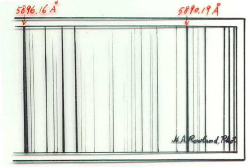 罗兰(Henry Augustus Rowland,1848—1901)是美国约翰·霍普金斯大学教授。他以周密的设计、精巧的工艺制成了高分辨率的平面光栅和凹面光栅,获得的太阳光谱极为精细,拍摄的光谱底片展开可达 50 英尺,波长从 2 152.91 Å 到 7 714.68 Å,用符合法求波长,精确度小于 0.01 Å。