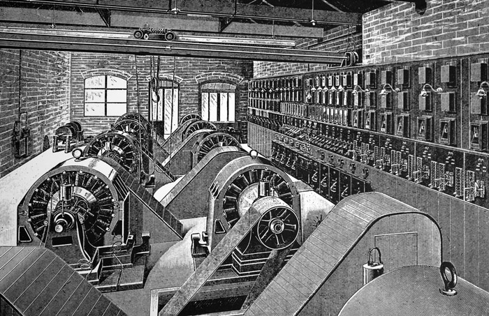 这一系列的发现集中在 19/20 世纪之交的年代里不是偶然的,是生产和技术发展的必然产物。特别是电力工业的发展,电气照明开始广泛应用,促使科学家研究气体放电和真空技术,才有可能发现阴极射线,从而导致了 X 射线和电子的发现,而 X 射线一旦发现,立即取得了广泛应用,又掀起了人们研究物理学的热潮。所以,随着 X 射线的发现而迅速展开的这一场物理学革命,有其深刻的社会背景和历史渊源。图 5 – 1 是一幅描述 19 世纪末电力工业的图片。