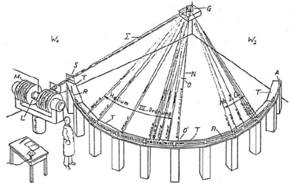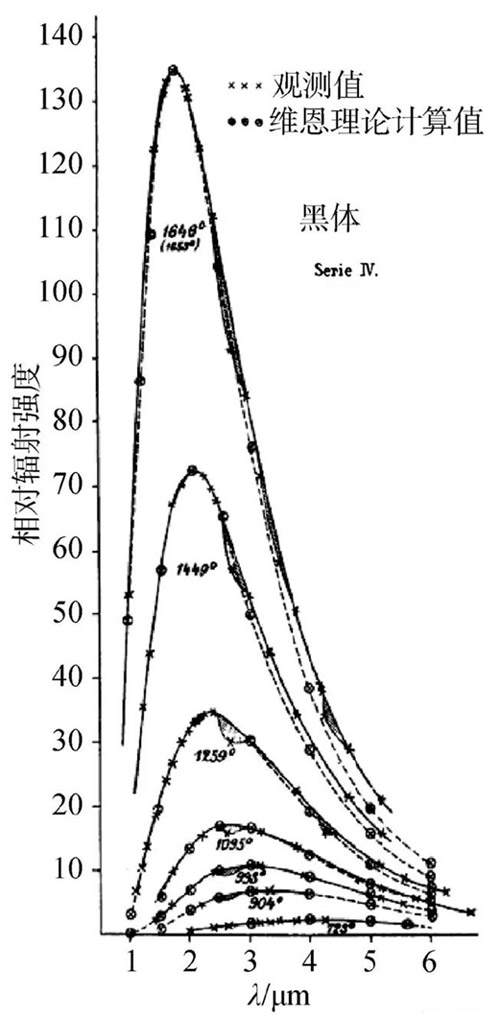 在热辐射的研究中,热辐射的辐射能量,特别是这一辐射的能量随波长分布的特性,往往是物理学家研究的重点。例如:德国的夫琅和费在观测太阳光谱的同时也对光谱的能量分布作了定性观测;英国的丁铎尔(J.Tyndall,1820—1893)、美国的克罗瓦(A.P.P.Crova,1833—1907)等人都测量了热辐射的能量分布曲线。