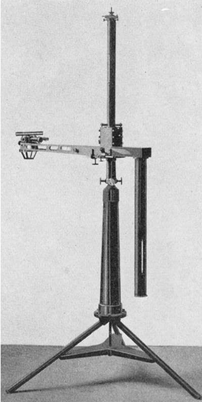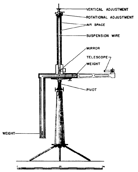 厄缶实验的原理虽然简单,但结果非常精确。和大多数精确的实验一样,这个实验也用示零法。装置如图 6 – 10,横杆长 40 cm,悬丝用铂铱合金。他用望远镜对准悬丝上挂着的小反射镜,观察望远镜上方的短刻度标尺,从而测量偏转角。从悬丝到刻度尺的距离为 62 cm。为了避免系统误差,厄缶还将横杆转 180°,换一个方向测量。1889 年得到第一次结果,平均为 η(A,B)< 5×10−8。1908 年得到第二次结果(直到 1922 年才正式发表,这时厄缶已经去世),实验精度达 η(A,B)< 2×10−9。这个实验是20世纪初最引人注目的经典实验之一。