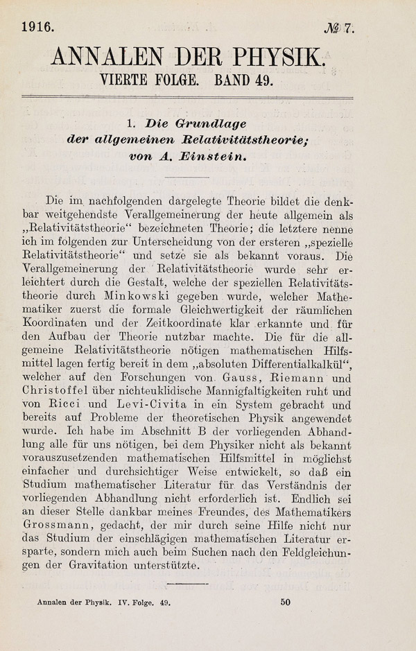 但是,爱因斯坦对这样的数学问题并不熟悉,于是,1912 年他找到老同学、苏黎世联邦工业大学数学教授格罗斯曼(M.Grossman,1878—1936),这立即引起了格罗斯曼的兴趣,爱因斯坦回忆道:“他查阅了文献并且很快发现,上面所提的数学问题早已由黎曼、里奇(Ricci)和勒维-契维塔(Levi-Civita)解决了。全部发展是同高斯的曲面理论有关的,在这一理论中第一次系统地使用了广义坐标系。”[11]