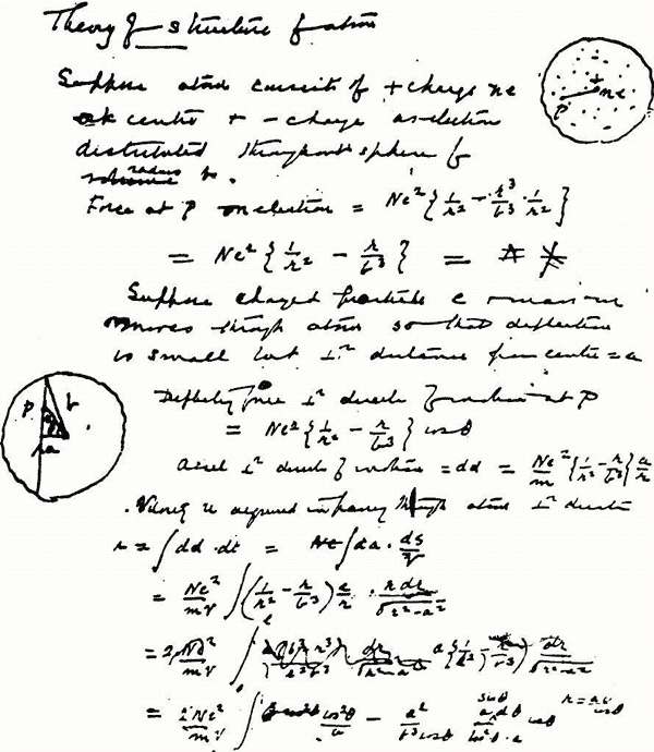“从原子内部结构获取信息的最有力的方法之一,在于研究高速粒子穿过物质的散射,例如 α 粒子和 β 粒子。由于它们的巨大运动能量,高速 α 粒子或 β 粒子一定会穿过挡在其路途中的原子。与原子碰撞的结果就使带电粒子偏离其直线轨道,这就可以搞清楚原子中造成偏折的电力的强度和分布。”