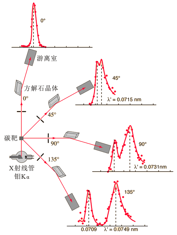 “从量子论的观点看,可以假设:任一特殊的 X 射线量子不是被辐射器中所有电子散射,而是把它的全部能量耗于某个特殊的电子,这电子转过来又将射线向某一特殊的方向散射,这个方向与入射束成某个角度。辐射量子路径的弯折引起动量发生变化。结果,散射电子以一等于 X 射线动量变化的动量反冲。散射射线的能量等于入射射线的能量减去散射电子反冲的动能。由于散射射线应是一完整的量子,其频率也将和能量同比例地减小。因此,根据量子理论,我们可以期待散射射线的波长比入射射线大”,而“散射辐射的强度在原始 X 射线的前进方向要比反方向大,正如实验测得的那样。”[1]