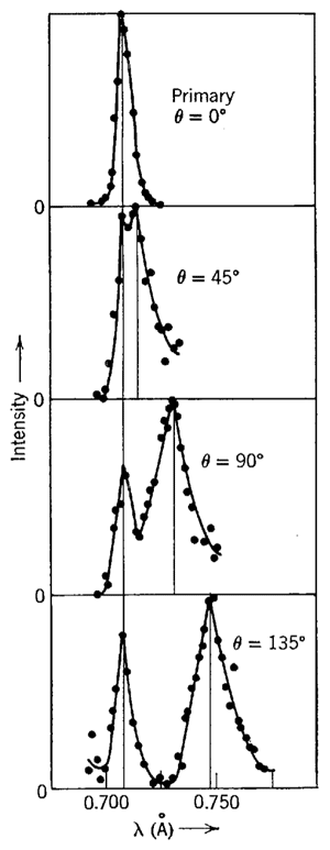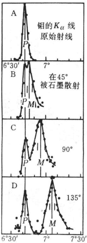 图 7 – 25 是康谱顿发表的部分曲线。从图中可以看出,X 射线散射曲线明显地有两个峰值,其中一个波长等于原始射线的波长(不变线),另一个波长变长(变线),变线对不变线的偏离随散射角变化,散射角越大,偏离也越大。