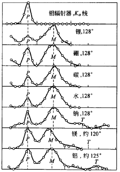 康普顿的学生,从中国赴美留学的吴有训(1897—1977)对康普顿效应的进一步研究和检验作出过重大贡献,除了针对杜安的否定作了许多有说服力的实验外,还证实了康普顿效应的普遍性。他测试了多种元素对 X 射线的散射曲线,结果都满足康普顿的量子散射公式(7 – 8)。图 7 – 26 就是康普顿和吴有训 1924 年发表的曲线,他们的论文题目是:《被轻元素散射时钼 Kα 线的波长》。文中写道:“这张图的重要点在于:从各种材料所得之谱在性质上几乎完全一致。每种情况,不变线 P 都出现在与荧光 M0Kα 线(钼的 Kα 谱线)相同之处,而变线的峰值,则在允许的实验误差范围内,出现在上述的波长变化量子公式所预计的位置 M 上。”[4]