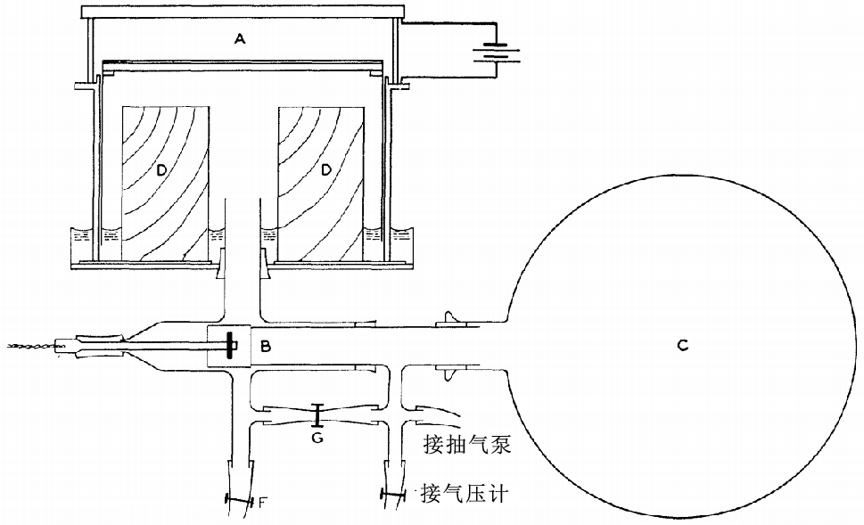 正当他用不同途径试图分离这两种成分之际,爆发了第一次世界大战。战后,他用电磁聚焦的方法继续这项工作,终于获得成功,并确证氛是由两种成分 20Ne 和 22Ne 组成的。阿斯通称他的仪器为质谱仪。用这套仪器他继续分离出了氯、汞、氮及其他几种稀有气体的同位素。图 9 – 8 是阿斯通早期的质谱仪外形图。