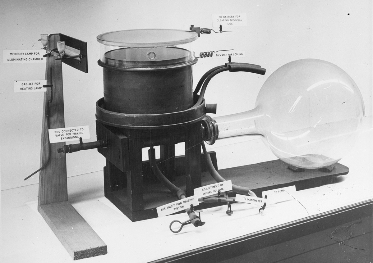 C.T.R.威尔逊是卡文迪什实验室出身的又一位实验物理学家。1896 年获博士学位后,先当表演员,后当物理实验教师。他业余对气象有特殊爱好,有兴趣了解云雾现象的成因,于是在实验室中进行模拟实验。1895 年初,他曾采用爱特肯(J.Aitkin)创造的方法,让潮湿空气膨胀,制造人工云雾。在实验中他发现,爱特肯有一个经验不符合事实,即当空气中没有尘埃时,不能产生云雾。威尔逊的结果却是,如果膨胀比足够大,也可能出现云雾。显然,在尘埃完全清除的密室中,一定还有别的凝结核心,他想到可能是出现了某种带电的原子。