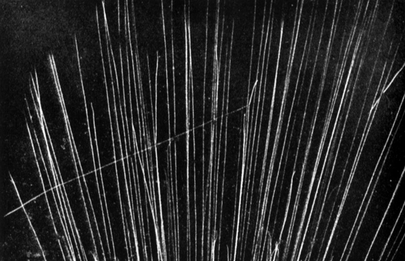 1925 年,布拉开特进一步改进云室方法,他把云室置于两个盖革计数器之间,安排了一套电路,使得只有当带电粒子相继穿过两个计数器,才能使云室动作,同时拍下照片。这种自动方法大大地提高了探测粒子的效率。就在这一年,他从改进的云室拍摄到了氮核蜕变的证据,如图 9 – 7。
