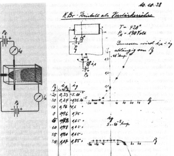 1938 年,德国的希尔胥(R.Hilsch)和 R.W.波尔(R.W.Pohl)在一片溴化钾晶体内成功地安放了一个栅极,如图 10 – 3。可惜,他们的“晶体三极管”工作频率极低,只能对周期长达 1 秒以上的信号起作用。