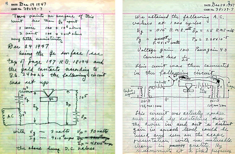 最后,他们决定在锗表面安置两个靠得非常近的触点,近到大约 5×10−3 厘米的样子。而最细的导线直径却有 10×10−3 厘米。实验能手布拉顿想出了一条妙计。他剪了一片三角形的塑料片,并在其狭窄而平坦的侧面上牢固地粘上金箔。然后用刀片从三角形塑料片的顶端把金箔割成两半。再用弹簧加压的办法,把塑料片和金箔一起压在锗片上,如图 10 – 4。于是,他们在 1947 年 12 月 23 日做成了世界上第一只能用于音频的固体放大器,这就是点接触型晶体管。这一天布拉顿的实验室日志如图 10 – 6。