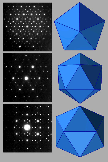 1984 年以前普遍认为,固体不是晶态就是非晶态,二者必居其一,晶体中的原子排列不但有长程序,而且具有周期性。实验事实确是如此。为了满足周期性平移的条件,要求晶体中的旋转对称只能有 1,2,3,4 和 6 次,而 5 次和 6 次以上的旋转对称都是不允许的。这成了晶体学中的一条基本法则。可是到了 1984 年,在美国国家标准局实验室工作的谢克特曼(D.Shechtman)却在研究用急冷凝固方法使较多的 Cr,Mn 和 Fe 等合金元素固溶于 Al 中,以期得到高强度铝合金时,在急冷 Al-Mn 合金中发现了一种奇特的具有金属性质的相,这种相具有相当明锐的电子衍射斑点,但不能标定成任何一种布拉维点阵,其电子衍射花样明显地显示出传统晶体结构所不允许的5次旋转对称性。谢克特曼等人在美国物理评论快报上发表的“具有长程取向序而无平移对称序的金属相”一文中首次报导了发现一种具有包括 5 次旋转对称轴在内的 20 面体点群对称合金相(如图 10 – 35),并称之为 20 面体相[4]。随后,在当年的同一份杂志上,刊载了另外两位物理学家的理论研究成果,他们指出,上述 20 面体的壳层在一定的成分和温度范围内,可能会由于自由能很低而存在,并且有 10 个 3 次旋转轴和 6 个 5 次旋转轴。由此计算出的电子衍射图的斑点位置和强度都与谢克特曼等人的实验结果相一致。据此,他们提出了“准晶体”的概念,并指出这种准晶体具有 20 面体旋转对称性,它们是“准周期性的”,而不是“非周期性的”。随着对准晶态物质研究的不断深入,人们逐渐明确了认识,认为准晶体仍然是晶体,它有着严格的位置序(因此能给出明锐的衍射),只不过不是像经典晶体那样原子呈三维周期性排列,而是呈准周期排列。