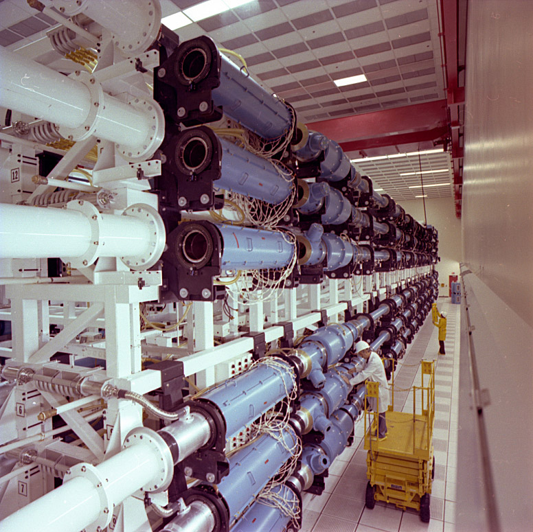 此外,尚有自由电子激光器、准分子激光器、离子激光器等。这些激光器各有特点,它们像雨后春笋一般地涌现出来,以适应科学技术各方面发展的需要。图 11 – 25 显示的是用于激光聚变实验的巨型 Shiva 激光器,是用铷玻璃激光器做成的,可产生 27 万亿瓦的瞬时功率。